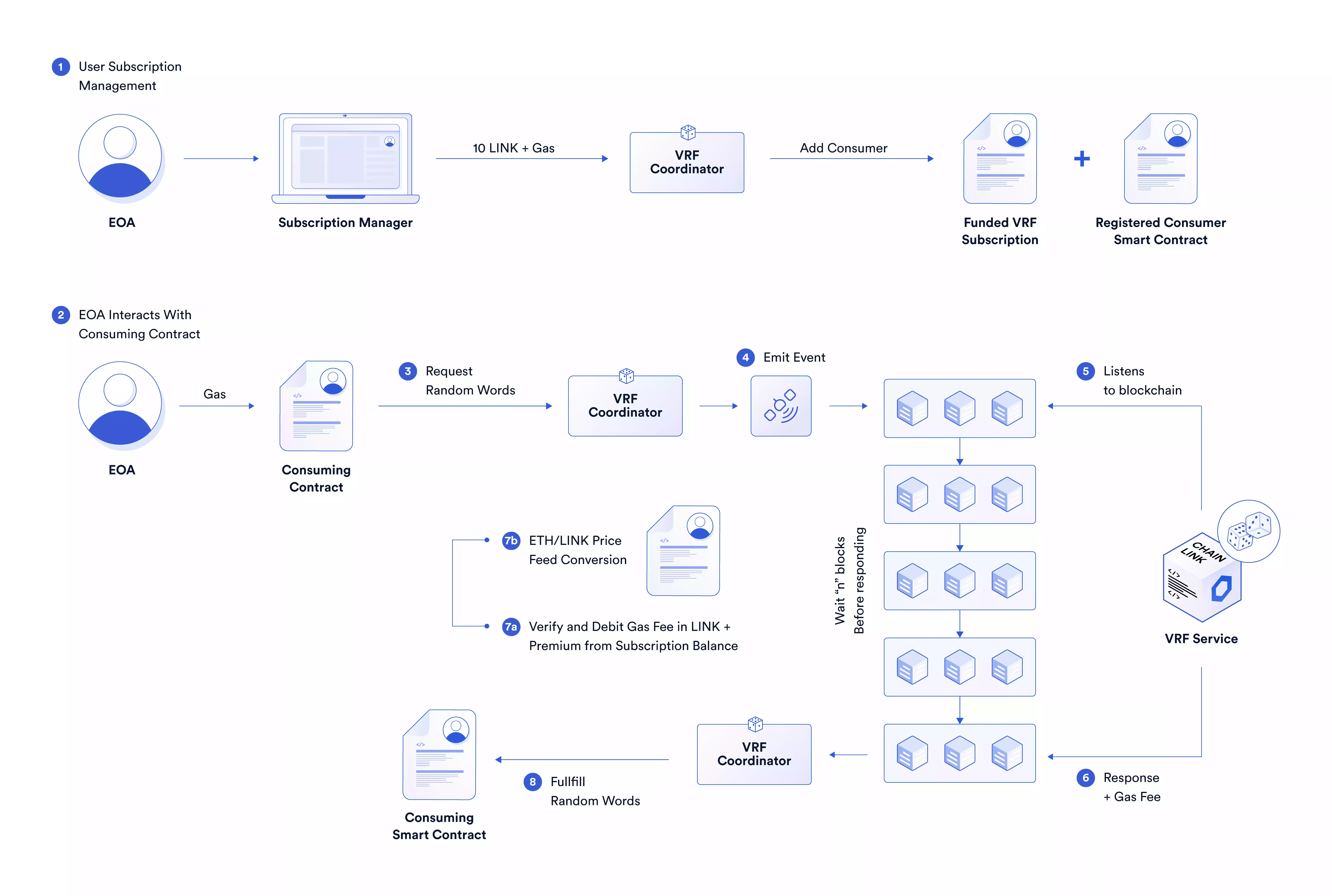 - VRF service (offchain component): Listens for requests by subscribing to the VRF Coordinator event logs and calculates a random number based on the block hash and nonce. The VRF service then sends a transaction to the